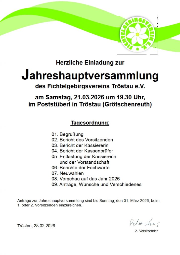 Wir hoffen, dass Ihnen unser Internetauftritt gefällt und Sie die notwendigen Informationen erhalten. Der FGV Tröstau heißt Sie sehr gerne bei einer seiner Veranstaltungen herzlich willkommen.